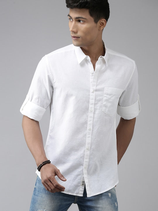 Men White Opaque Cotton Linen Casual Shirt