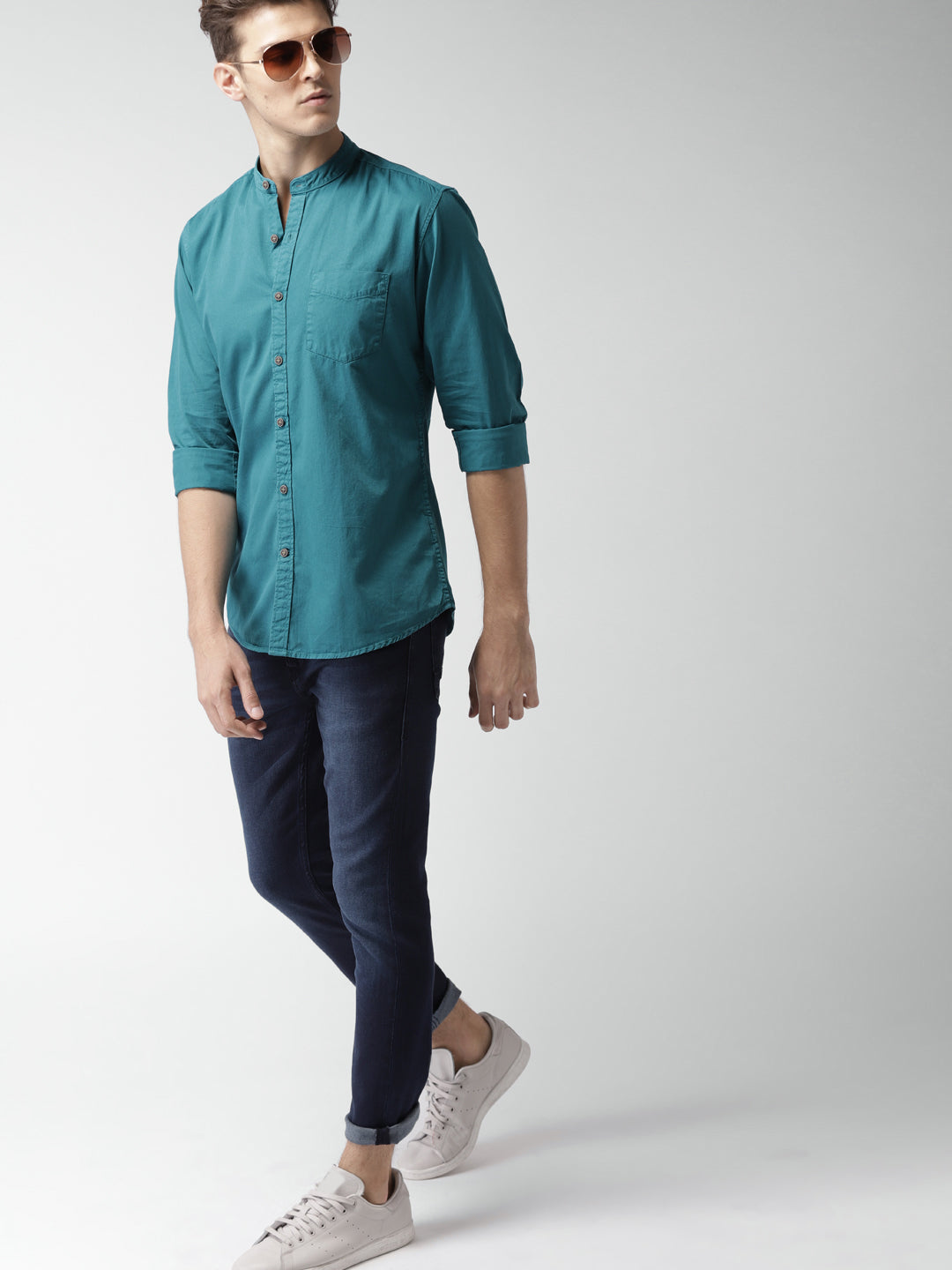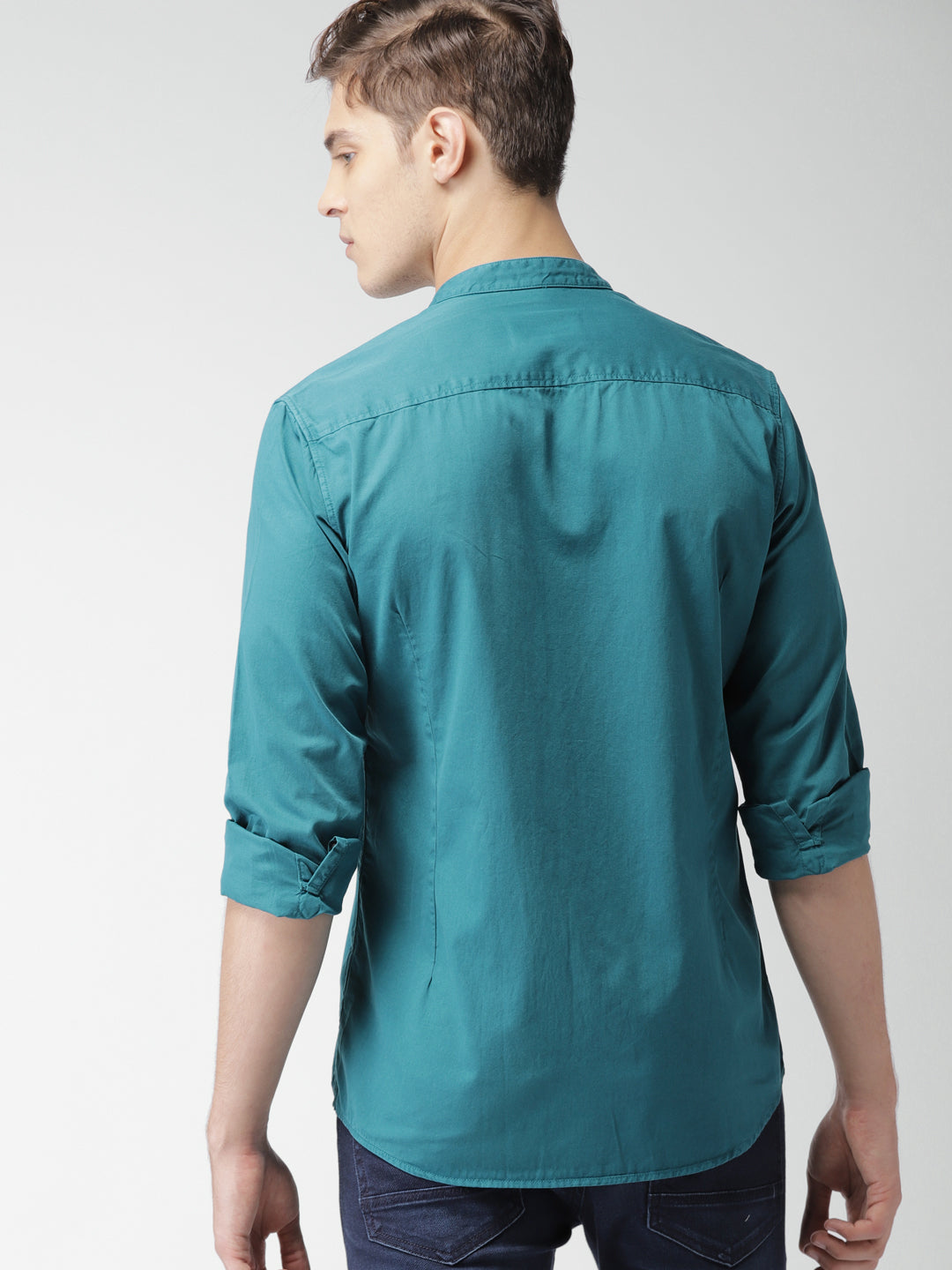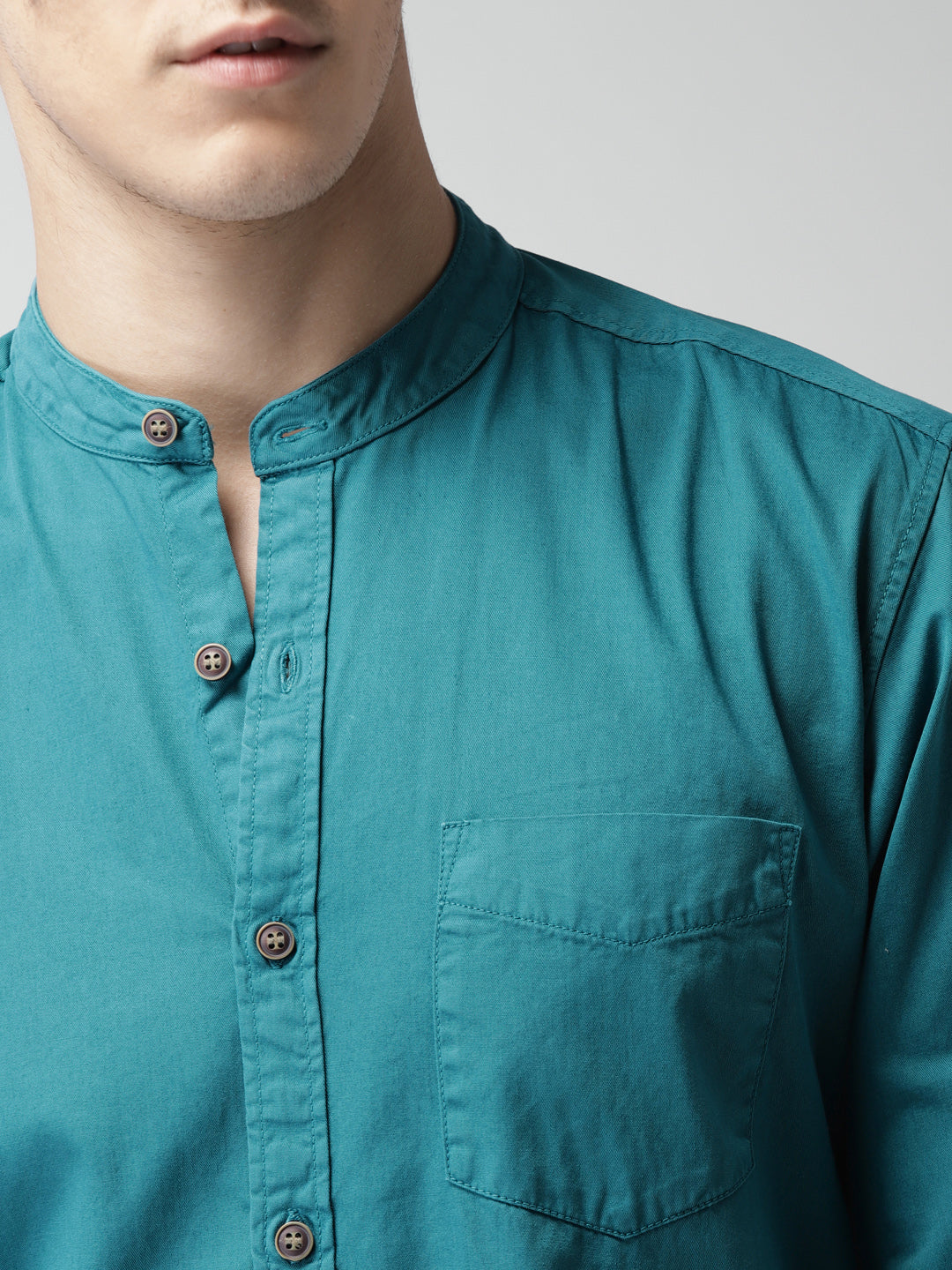 Sea Green solid regular fit Casual shirt, has a band collar, button placket, have pocket, long regular sleeves, curved hem