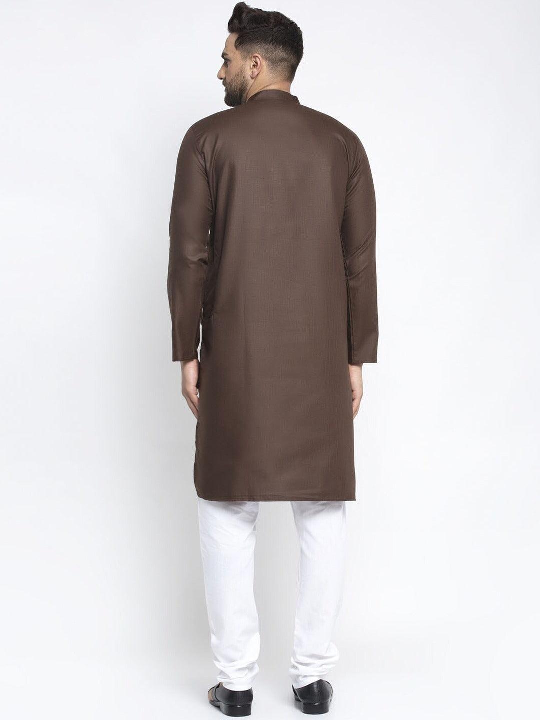 Coffee Brown and white pathani above knee kurta, has a shirt collar, long sleeves, asymmetric hem