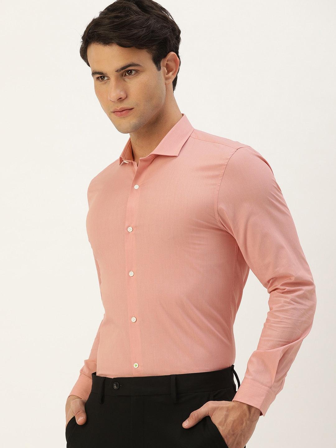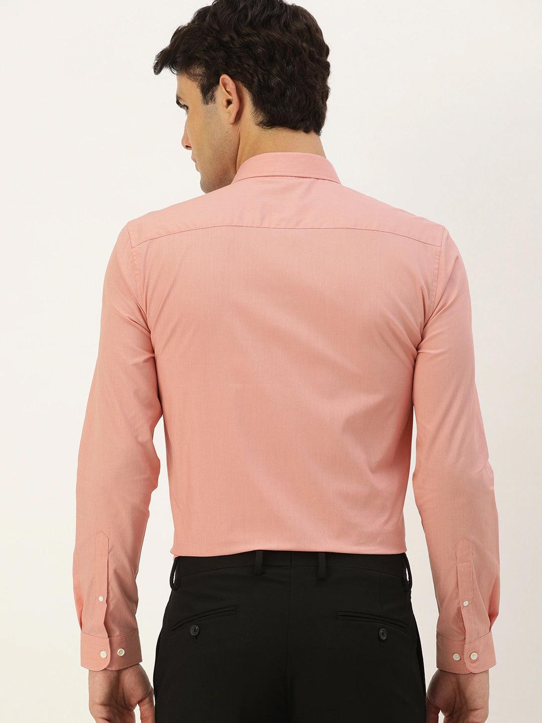 Peach Solid formal shirt ,has a spread collar, button placket, 1 patch pocket, long roll-up sleeves, straight hem