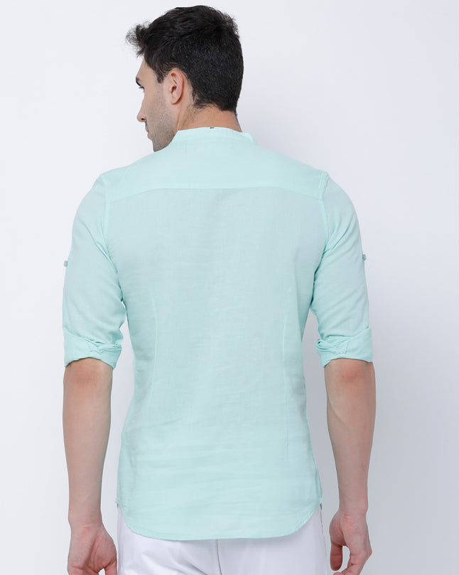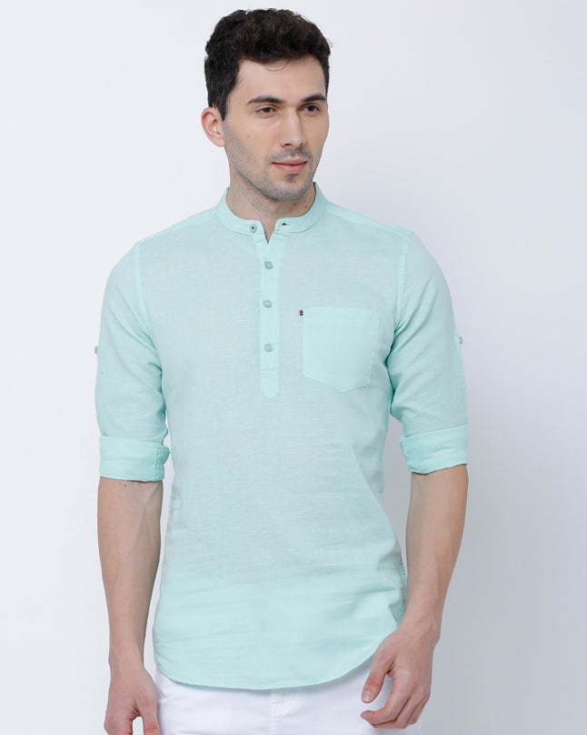 Turquoise Short Kurta Style Casual Shirt With Band Collar For Men