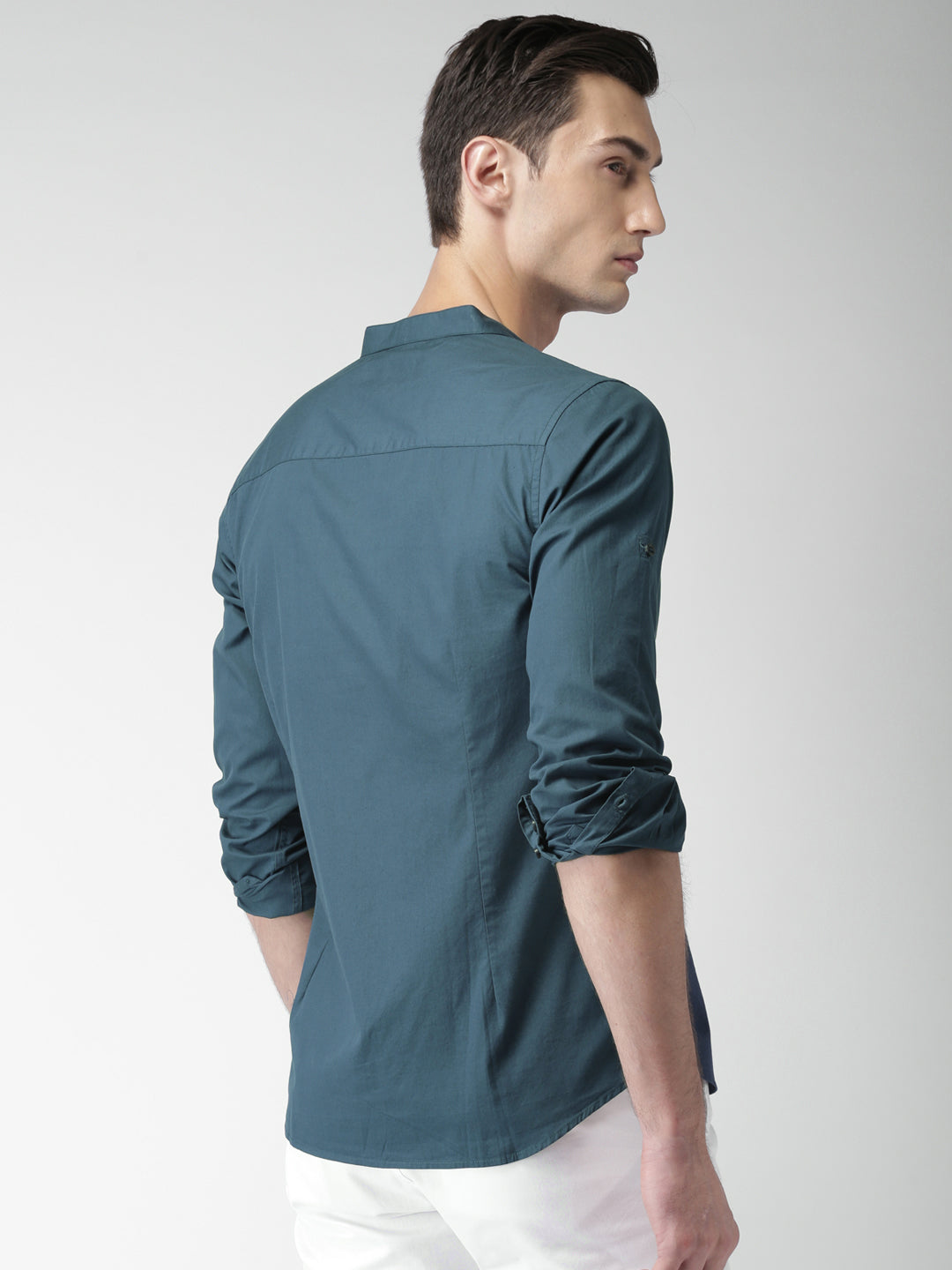 Dark Grey solid regular fit Casual shirt, has a band collar, button placket, have pocket, long regular sleeves, curved hem
